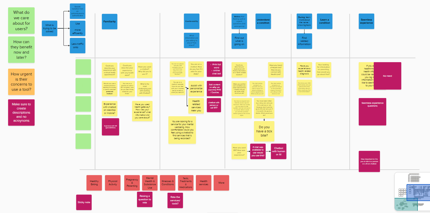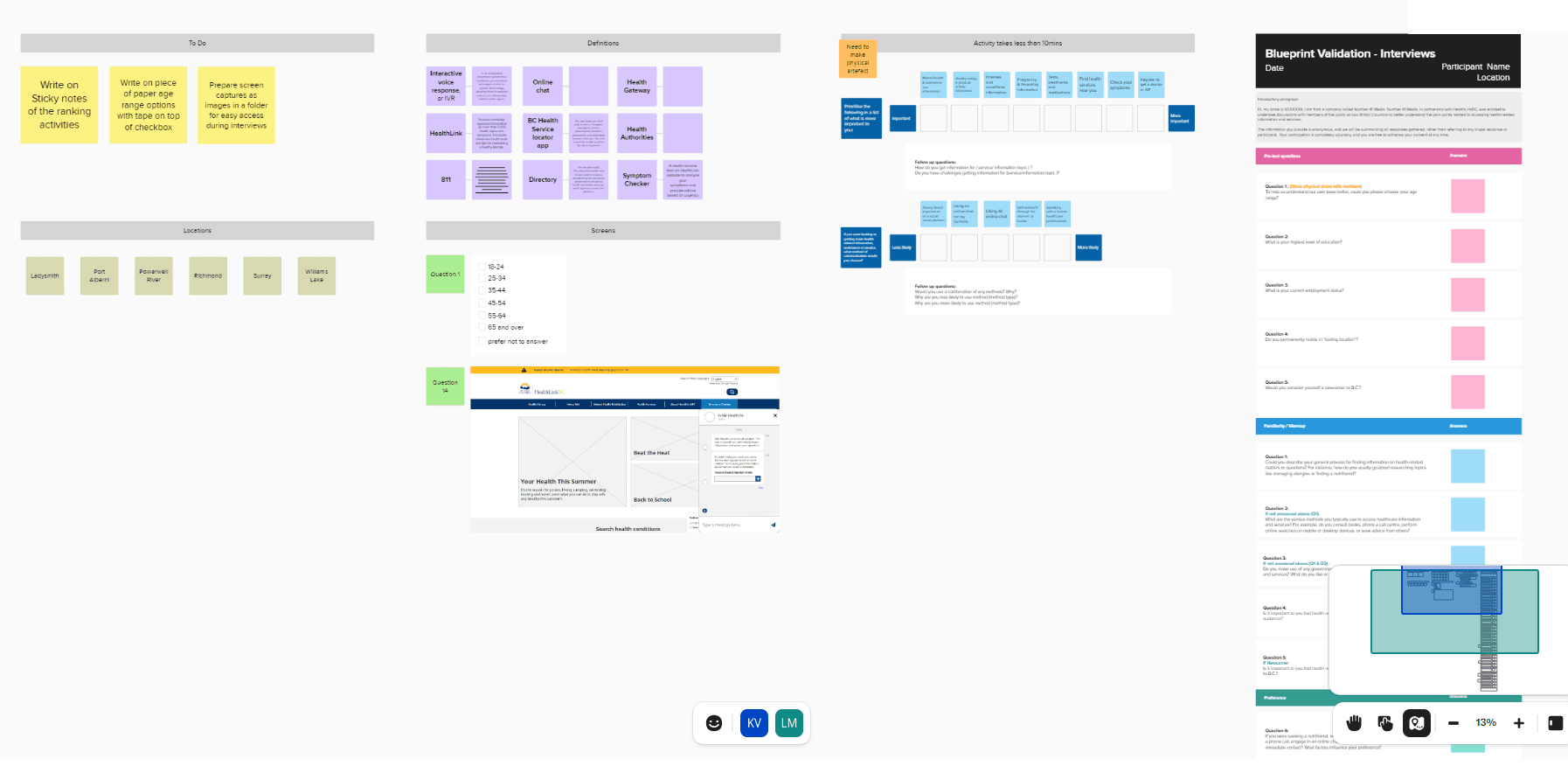 I designed conversational research prompts combining card sorting, Likert-scale, and open-ended questions to gather both behavioural patterns and contextual nuance tied to participants’ lifestyles, current searching behaviour, access to technology, and awareness of government health resources.